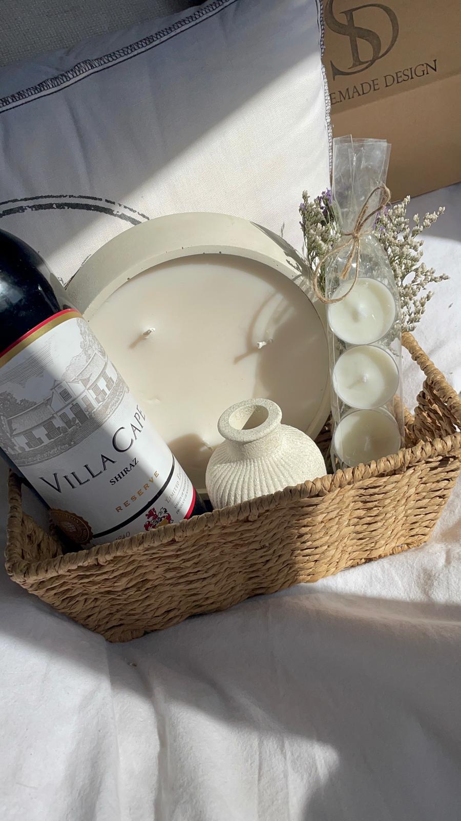 ובקבוק יין אדום איכותי. הכל ארוז בסלסילה בתוספת זר פרחים מיובשים