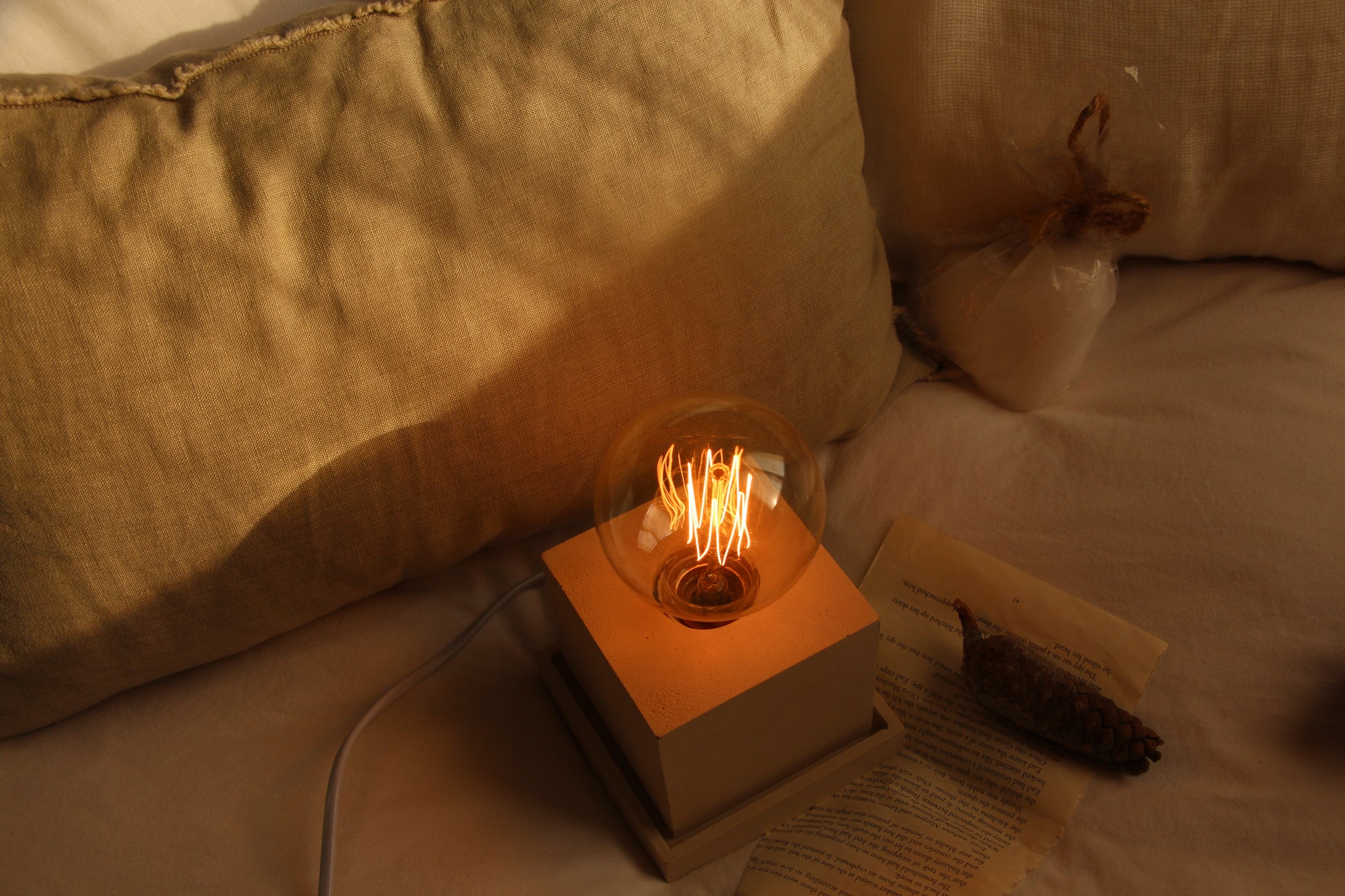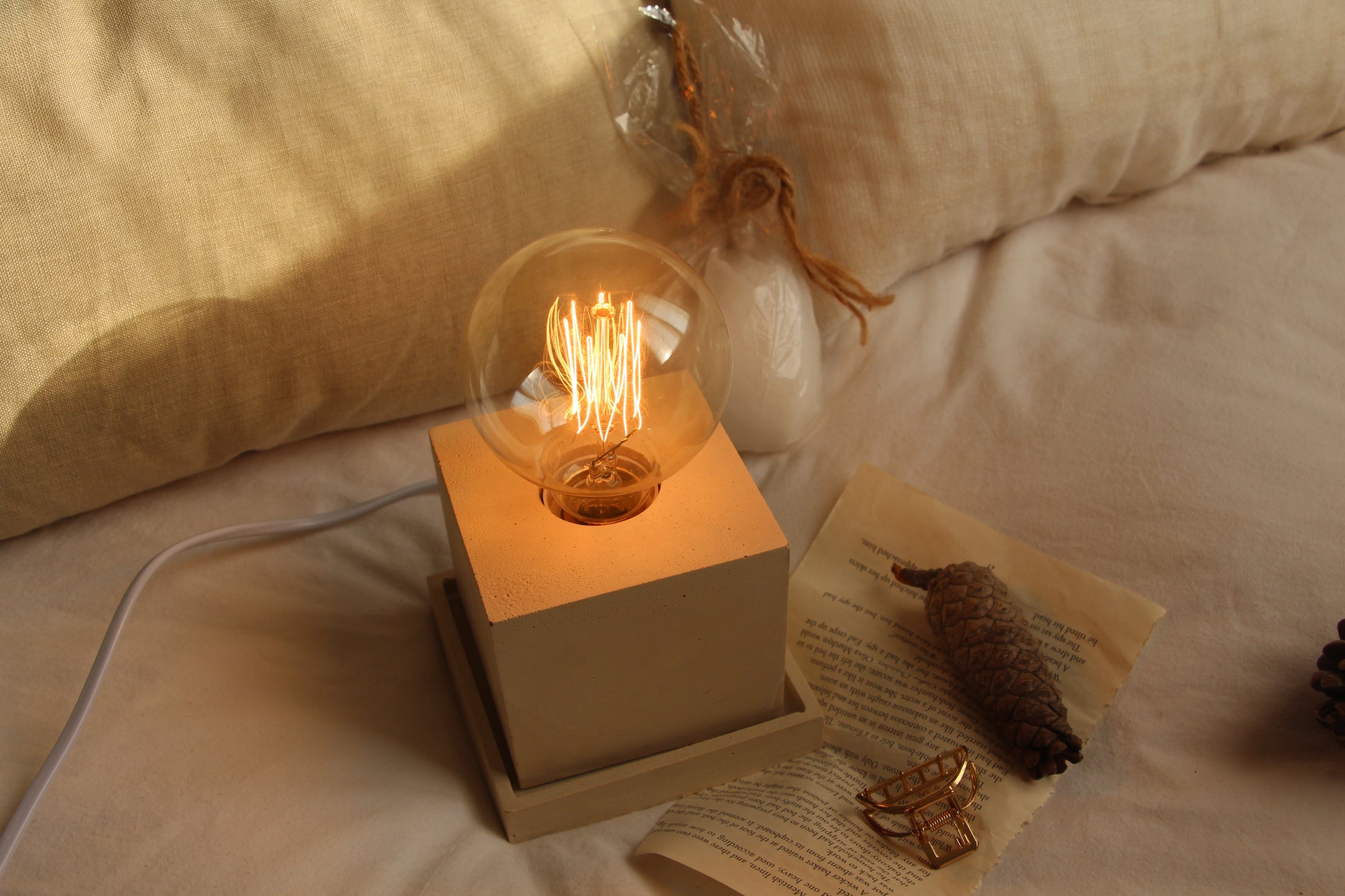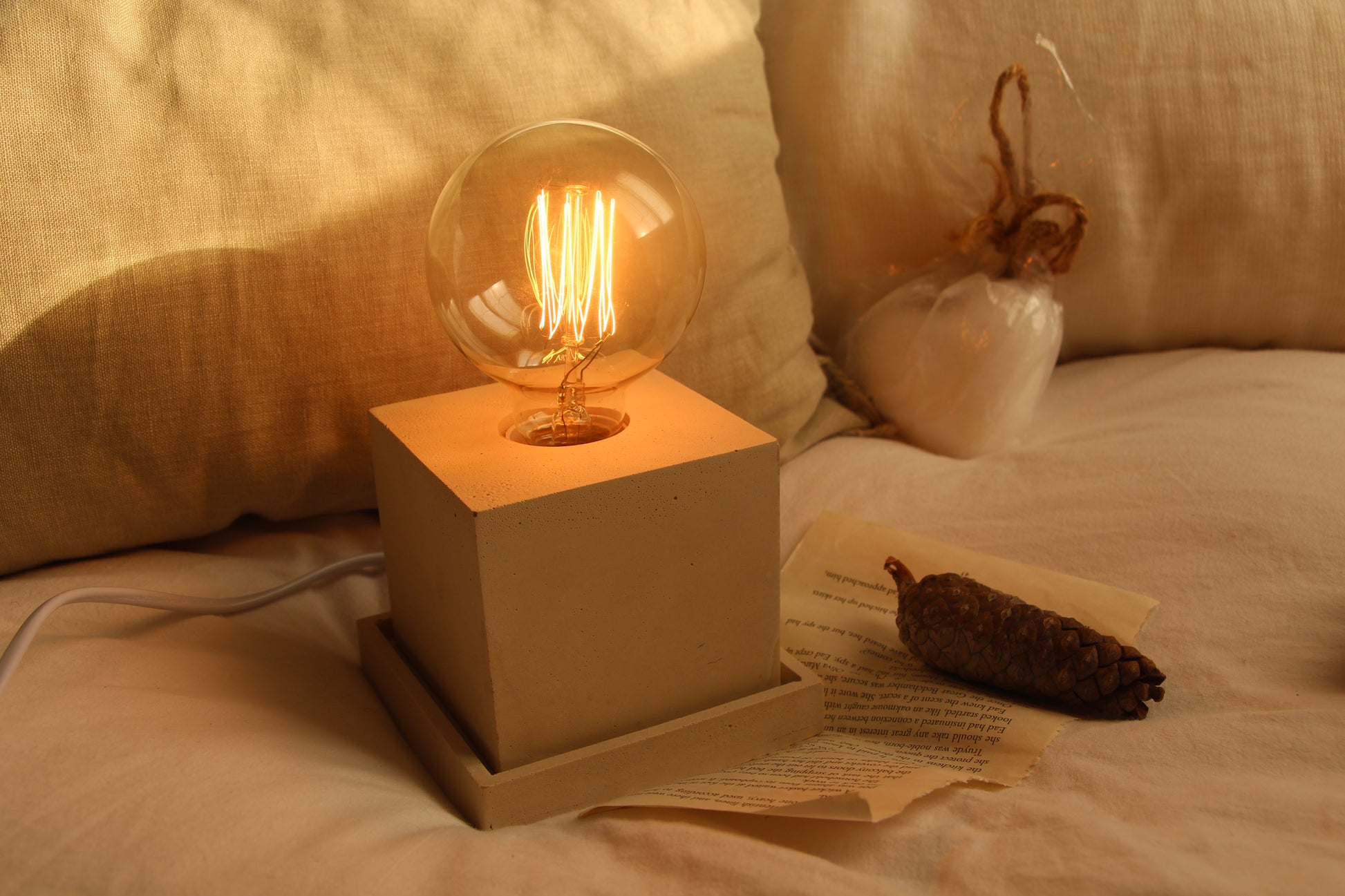 מנורה מרובעת דקורטיבית יצוקה מבטון בעבודת יד, מושלמת לחדר השינה כמנורת לילה או לחלל המגורים כמנורת אוירה