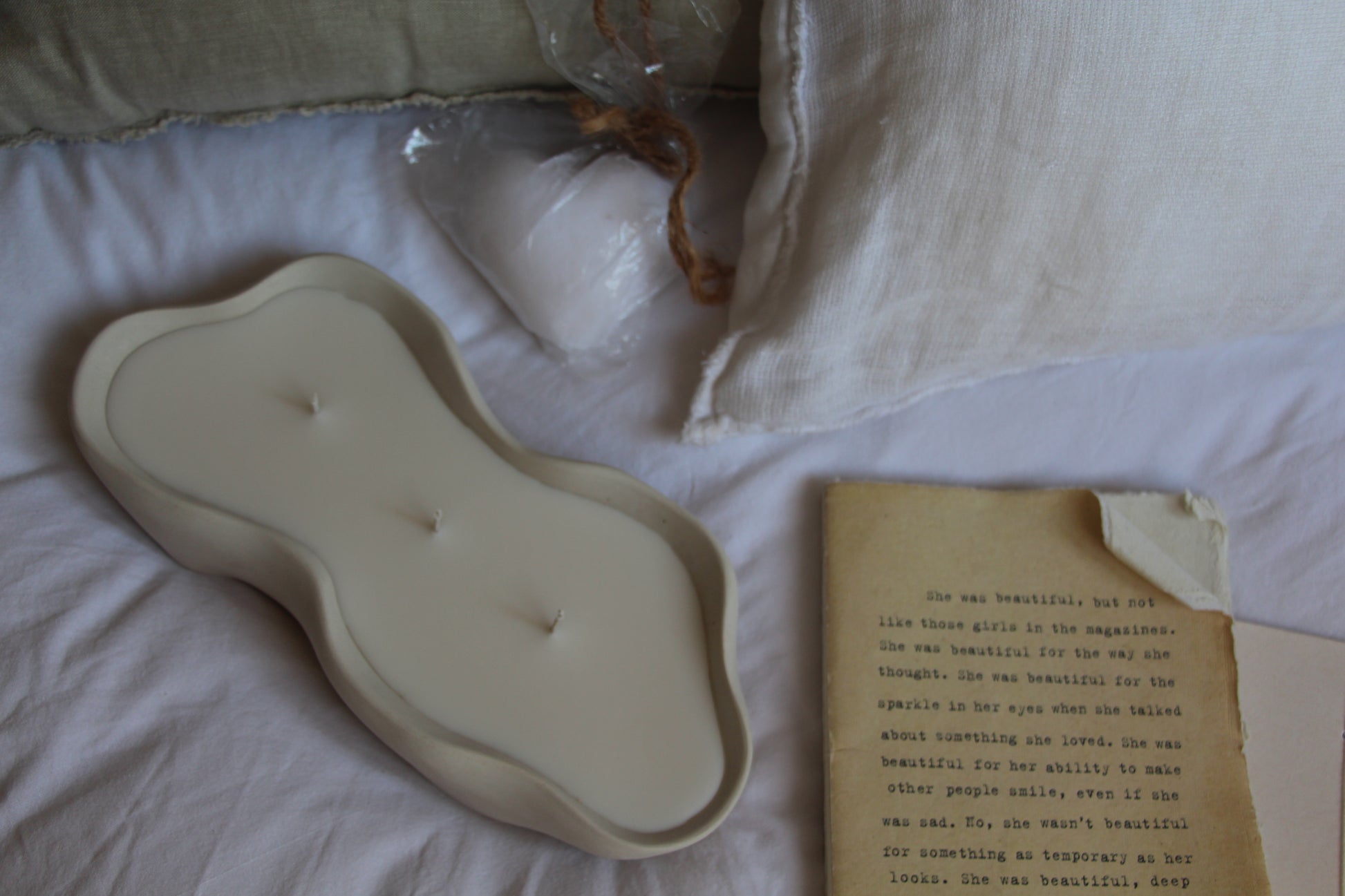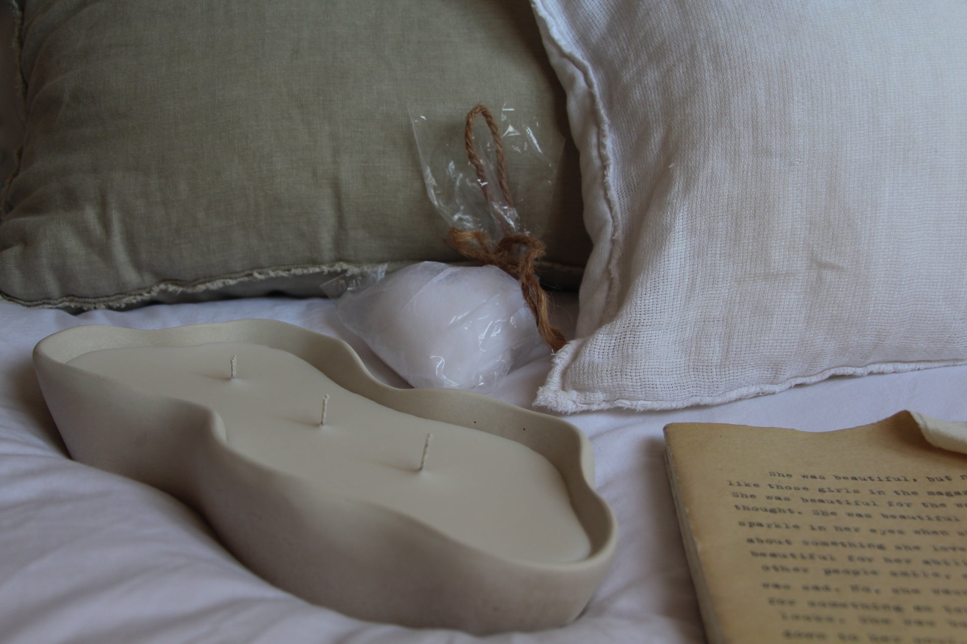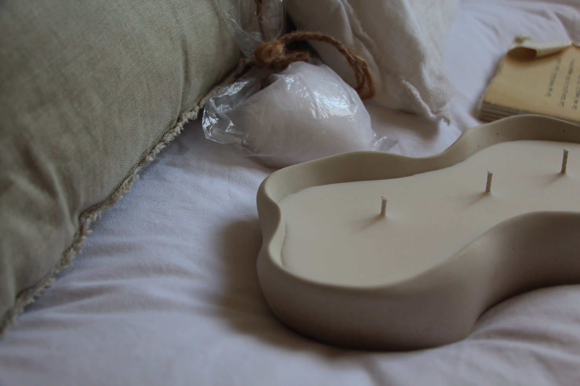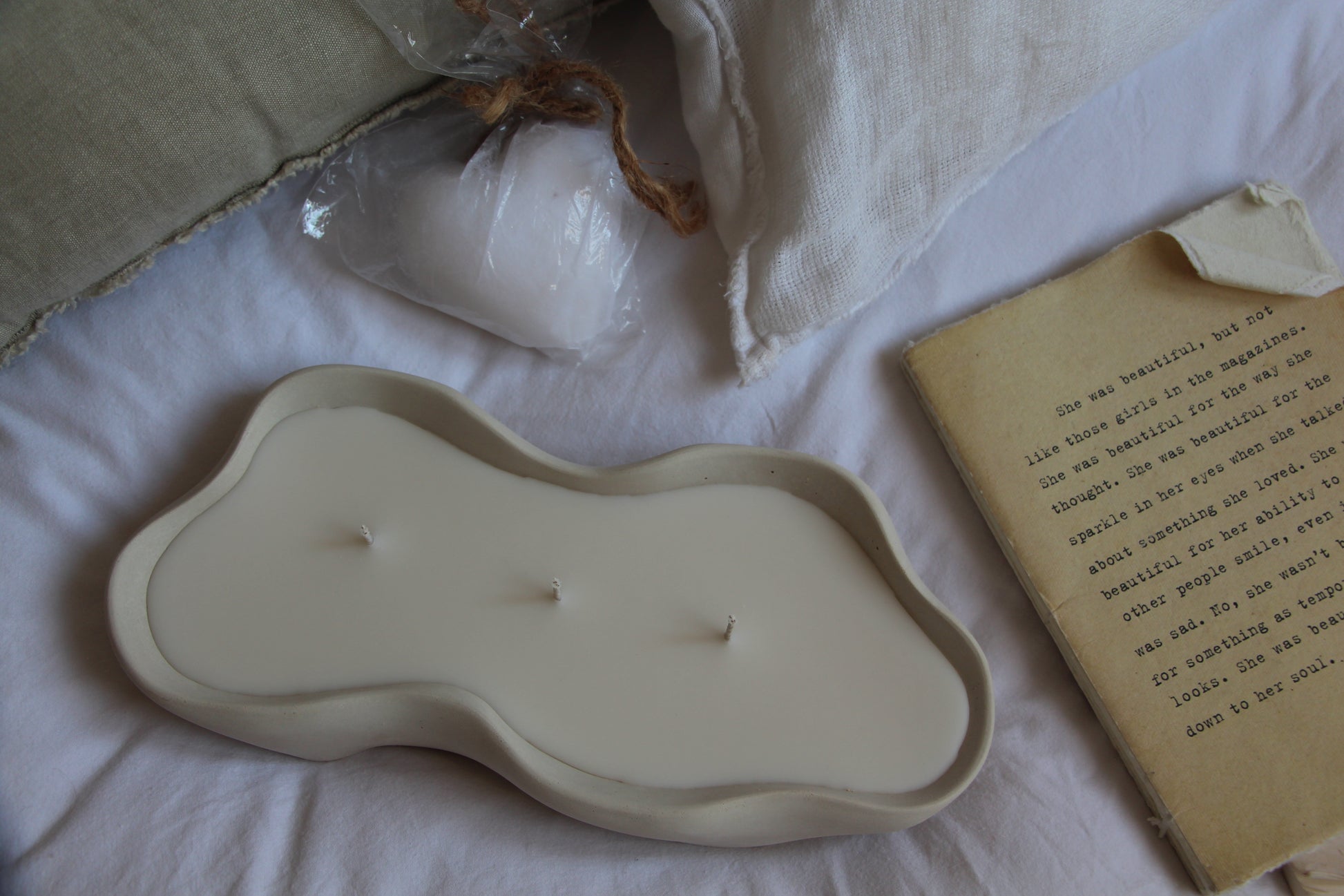 נר גדול בקערה אמורפית עשויה בטון בעבודת יד בצבע בז'-לבן. יצוקה בשעוות סויה טבעית בניחוח עדין ונעים של אגס ופרזיה.. נר מיוחד ומלא אוירה