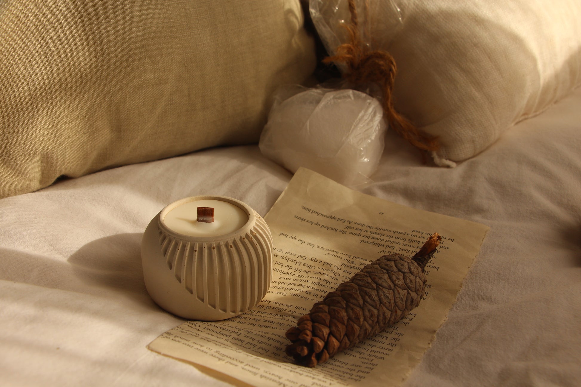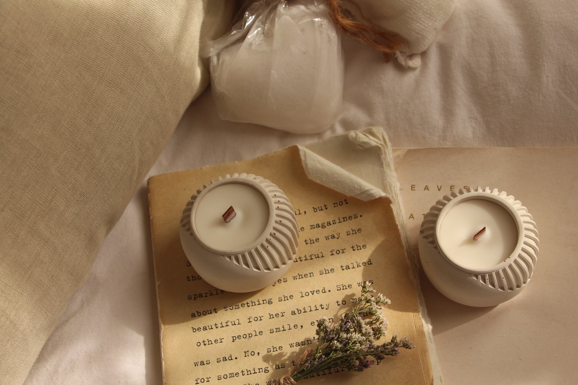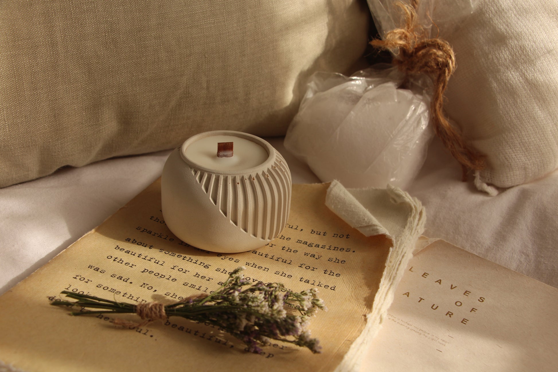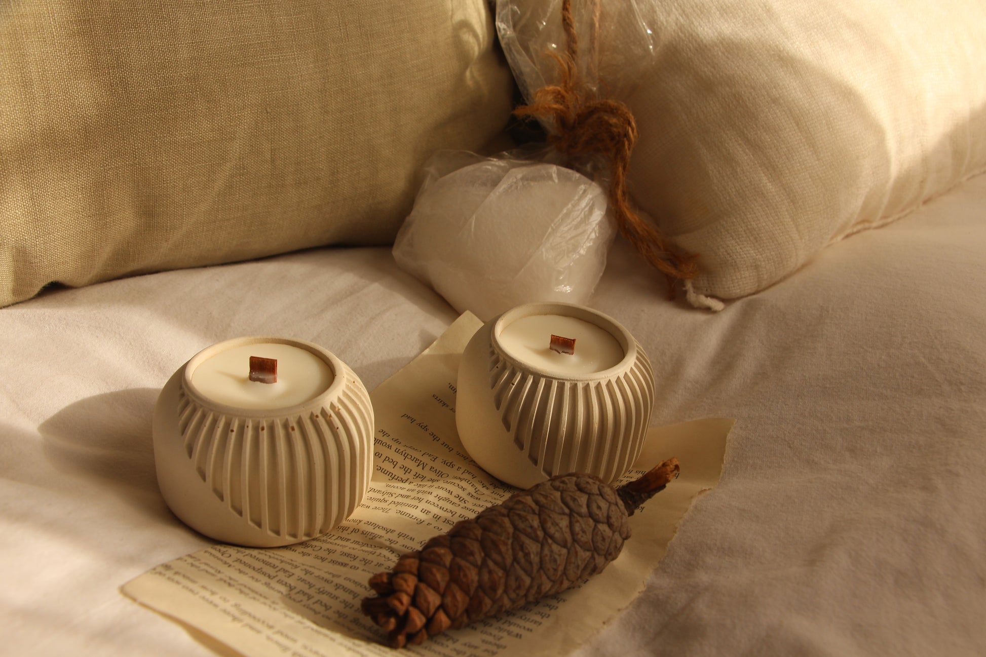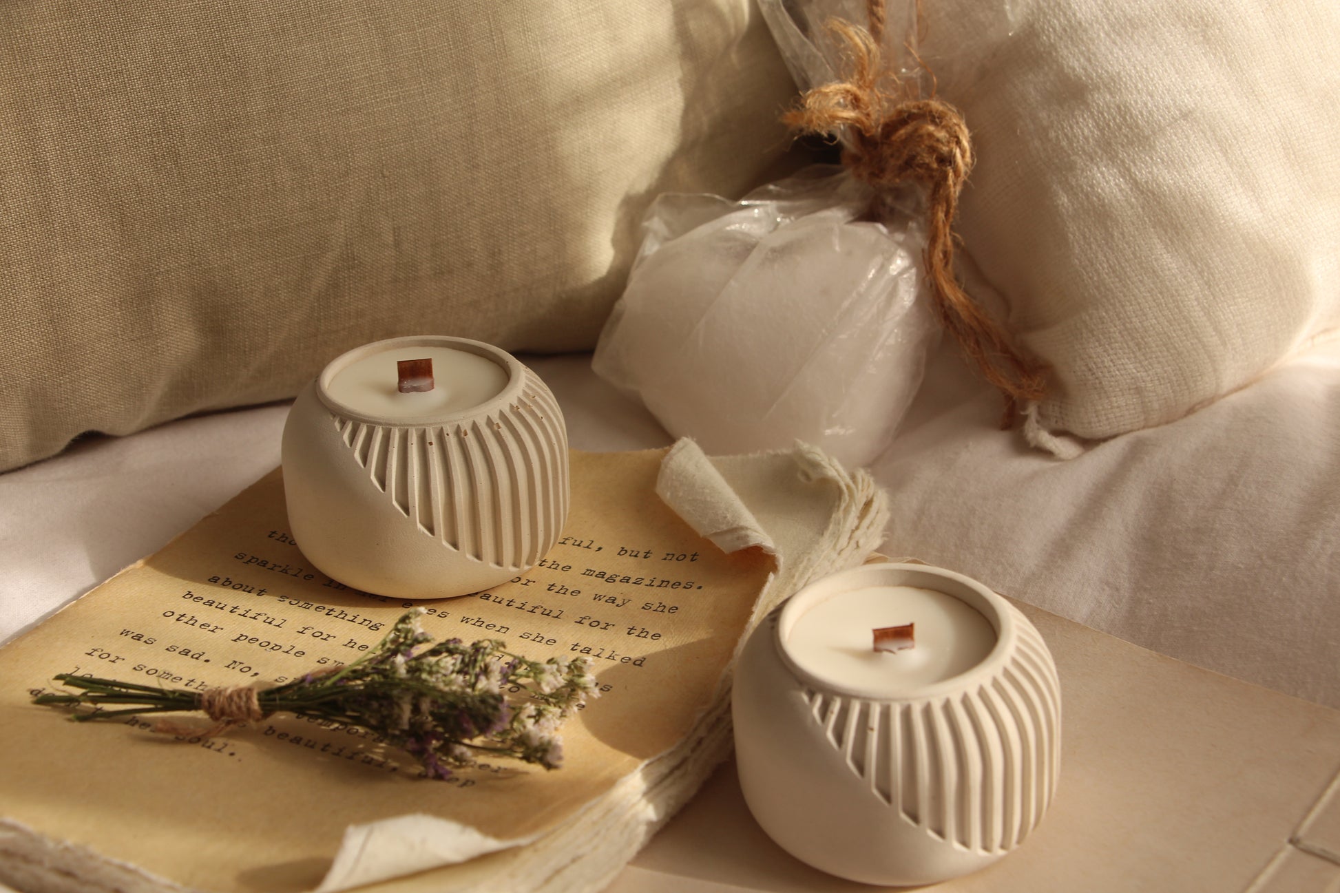 נר בטקסטורה משולבת, חלק ופסים, עשוי בטון בעבודת יד בצבע בז'- לבן ויצוק משעוות סויה טבעית בניחוח עדין ונעים של אגס ופרזיה