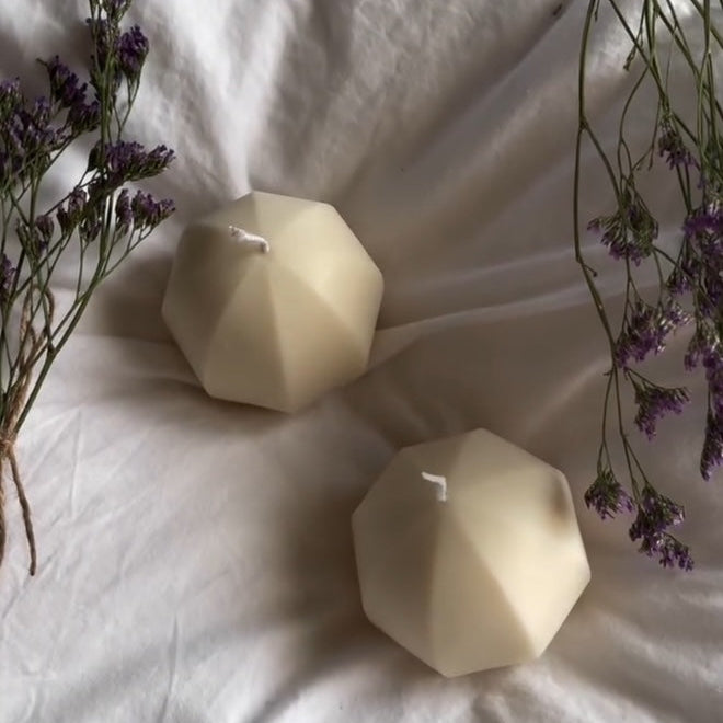 נר מקסים וייחודי בצורת כדור בעל פאות מיושרות. עשוי שעוות סויה בניחוח עדין ונעים של אגס ופרזיה