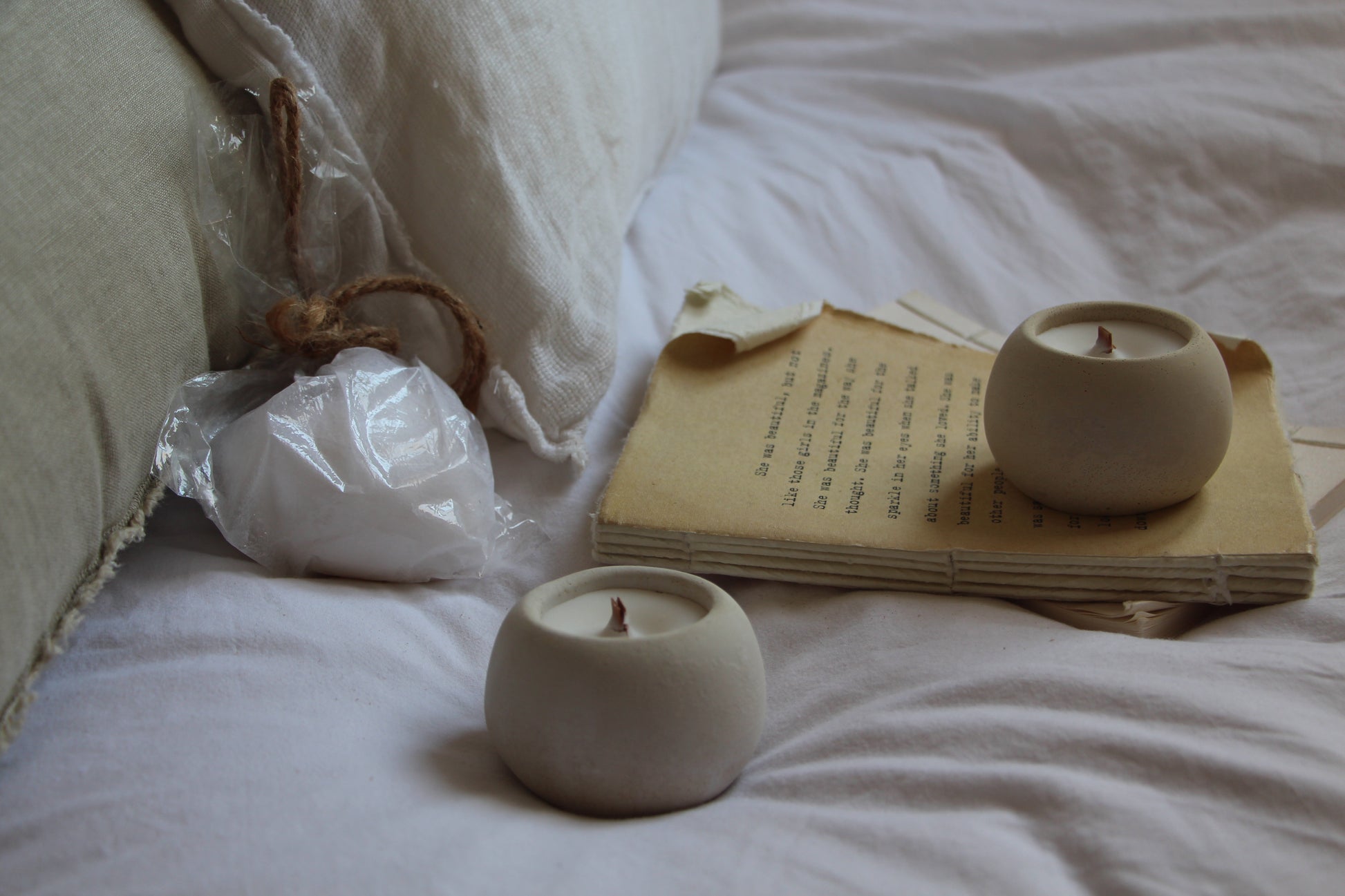 נר בצורת כדור עשוי בטון בעבודת יד בצבע בז'- לבן. יצוק בשעוות סויה טבעית, בניחוח עדין ונעים של אגס ופרזיה