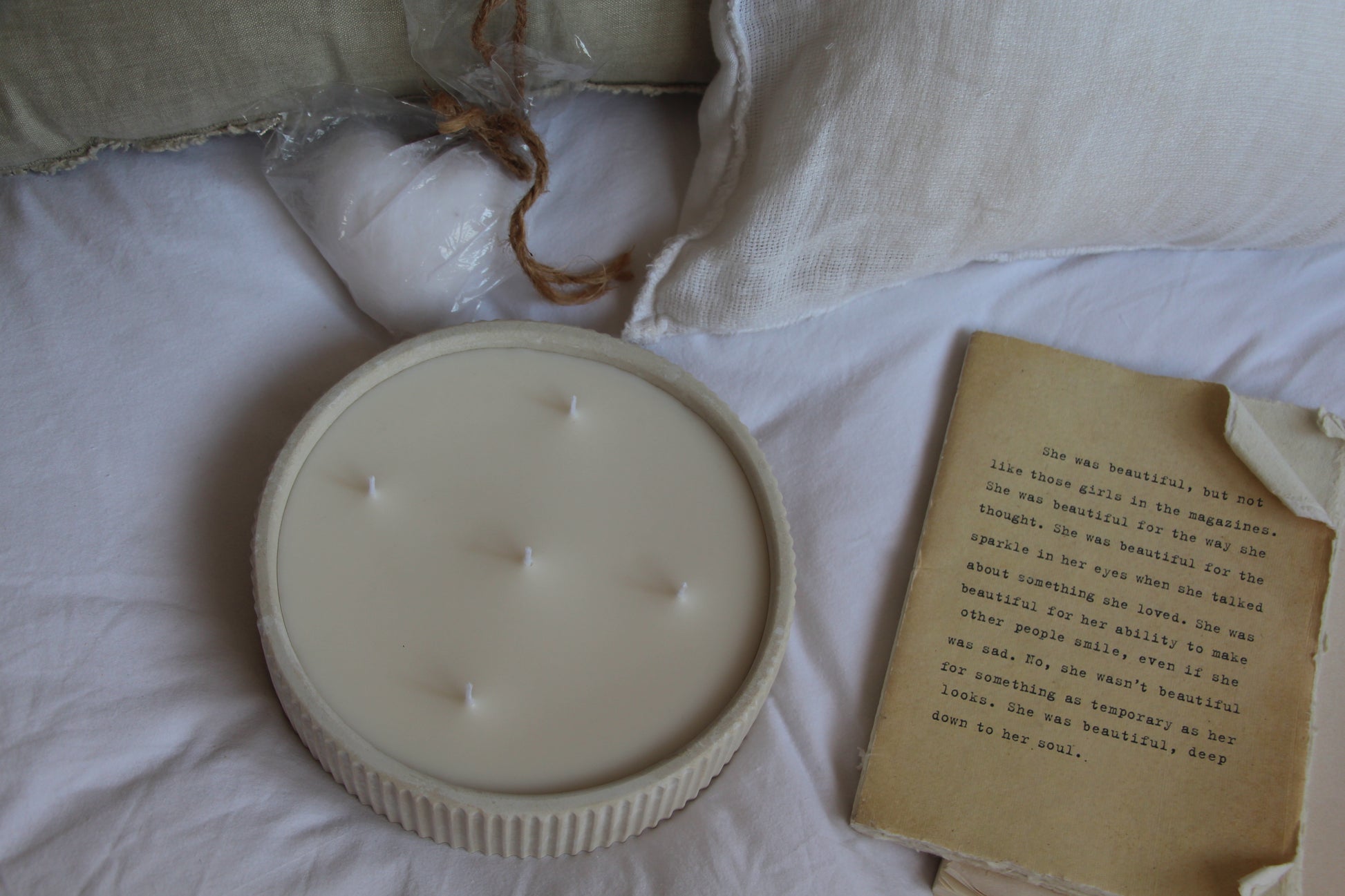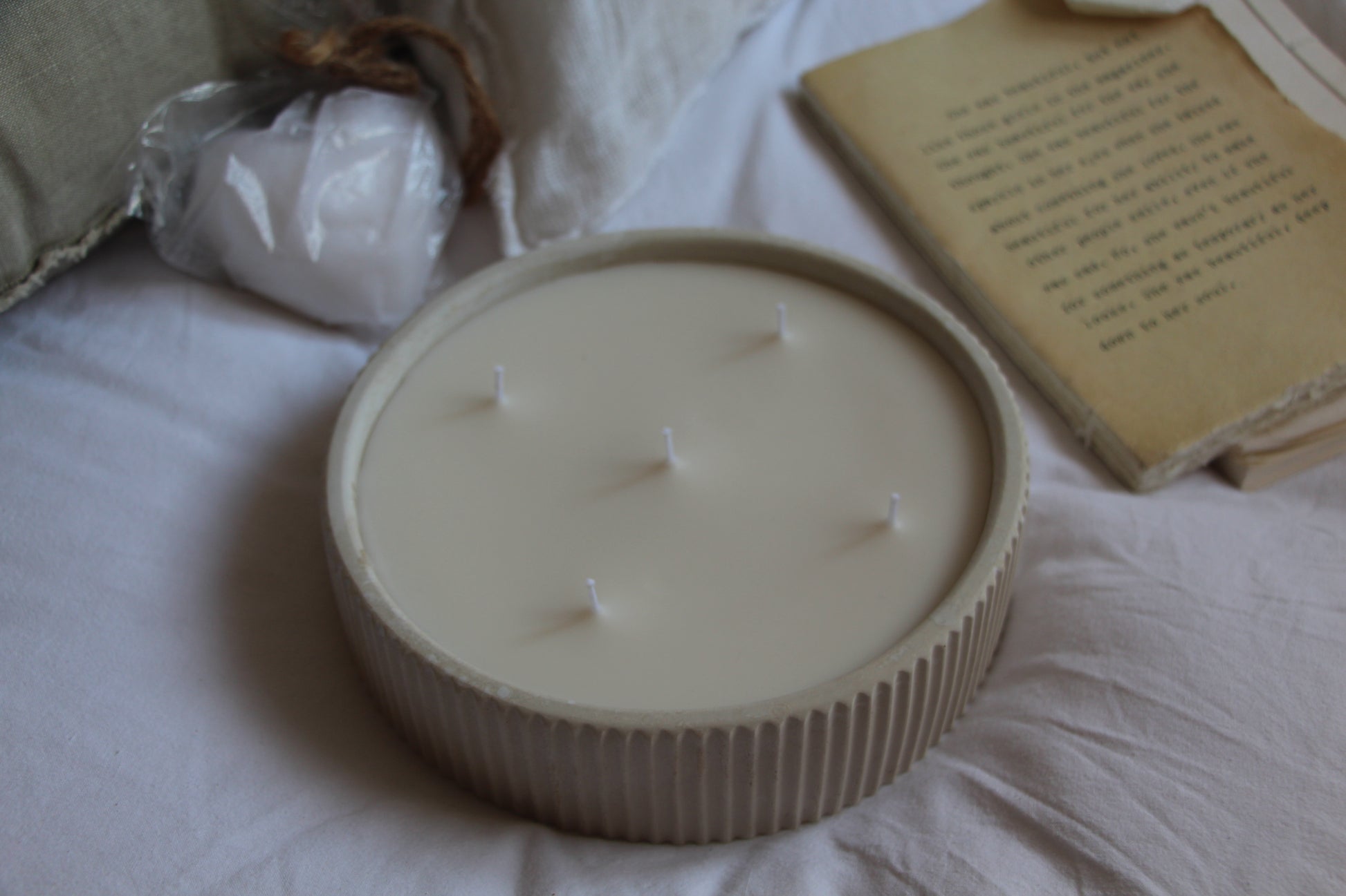 נר ענק בקערת פסים, עשוי בטון בעבודת יד בצבע בז'-לבן. יצוק משעוות סויה טבעית בניחוח עדין  ונעים של אגס ופרזיה
