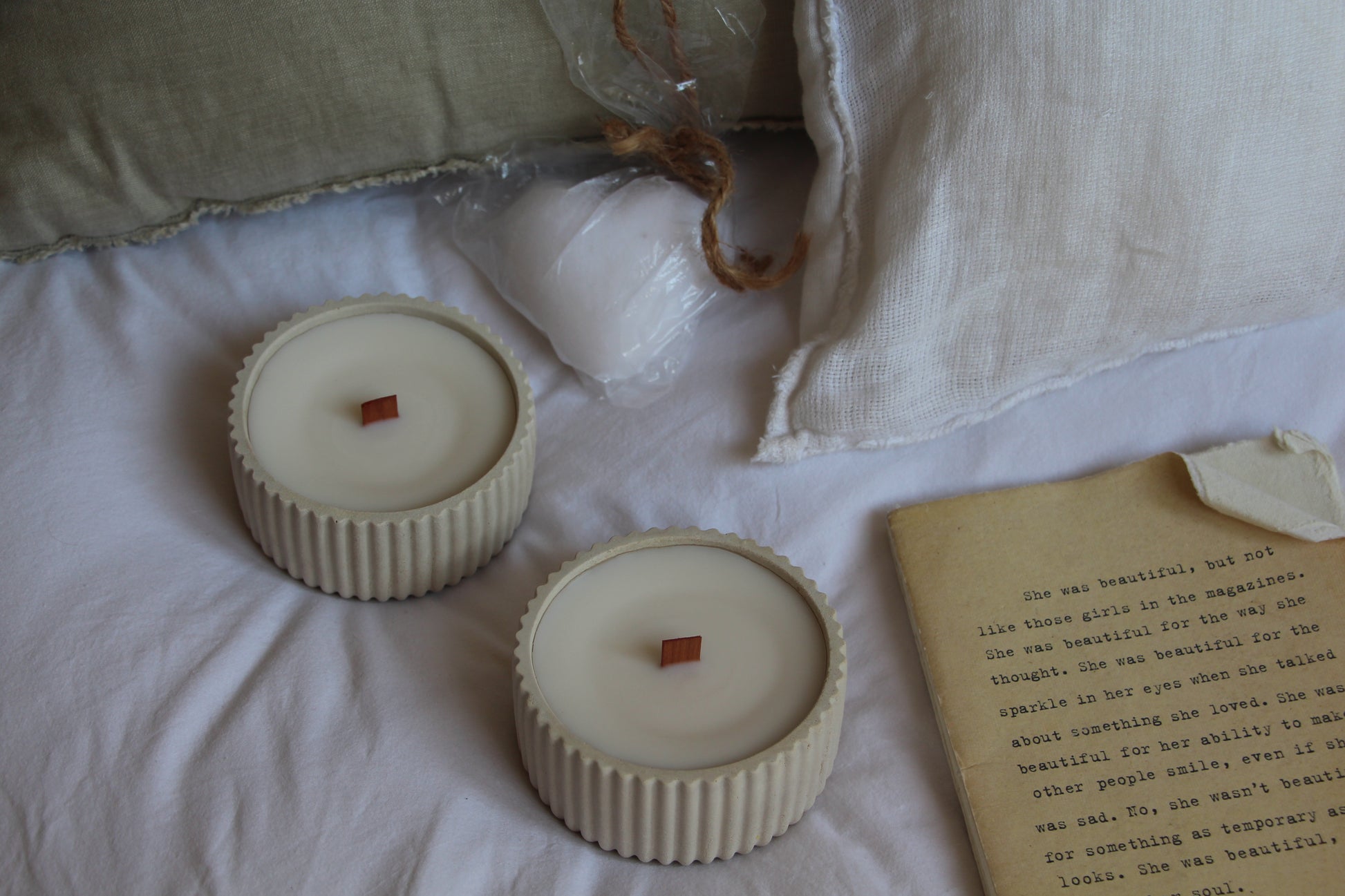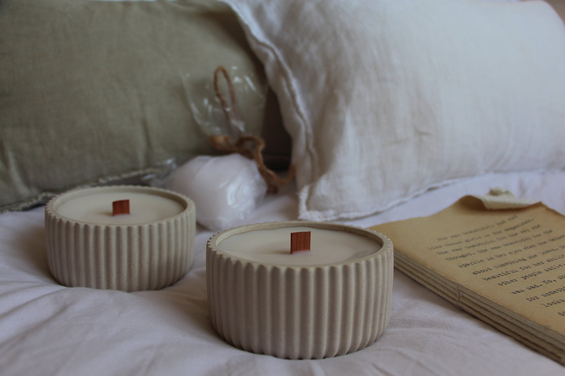 נר מקסים ובעל נוכחות בקערת פסים עשוי בטון בעבודת יד בצבע בז'-לבן. יצוק משעוות סויה טבעית בניחוח עדין ונעים של אגס ופרזיה