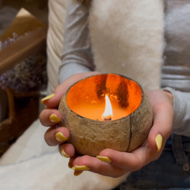 נר ייחודי בקליפת קוקוס טבעית, יצוק בשעוות סויה בניחוח עדין ונעים של אגס ופרזיה. לנר פתיל גדול היוצר סאונד רומנטי של פיצפוץ בזמן הבערה