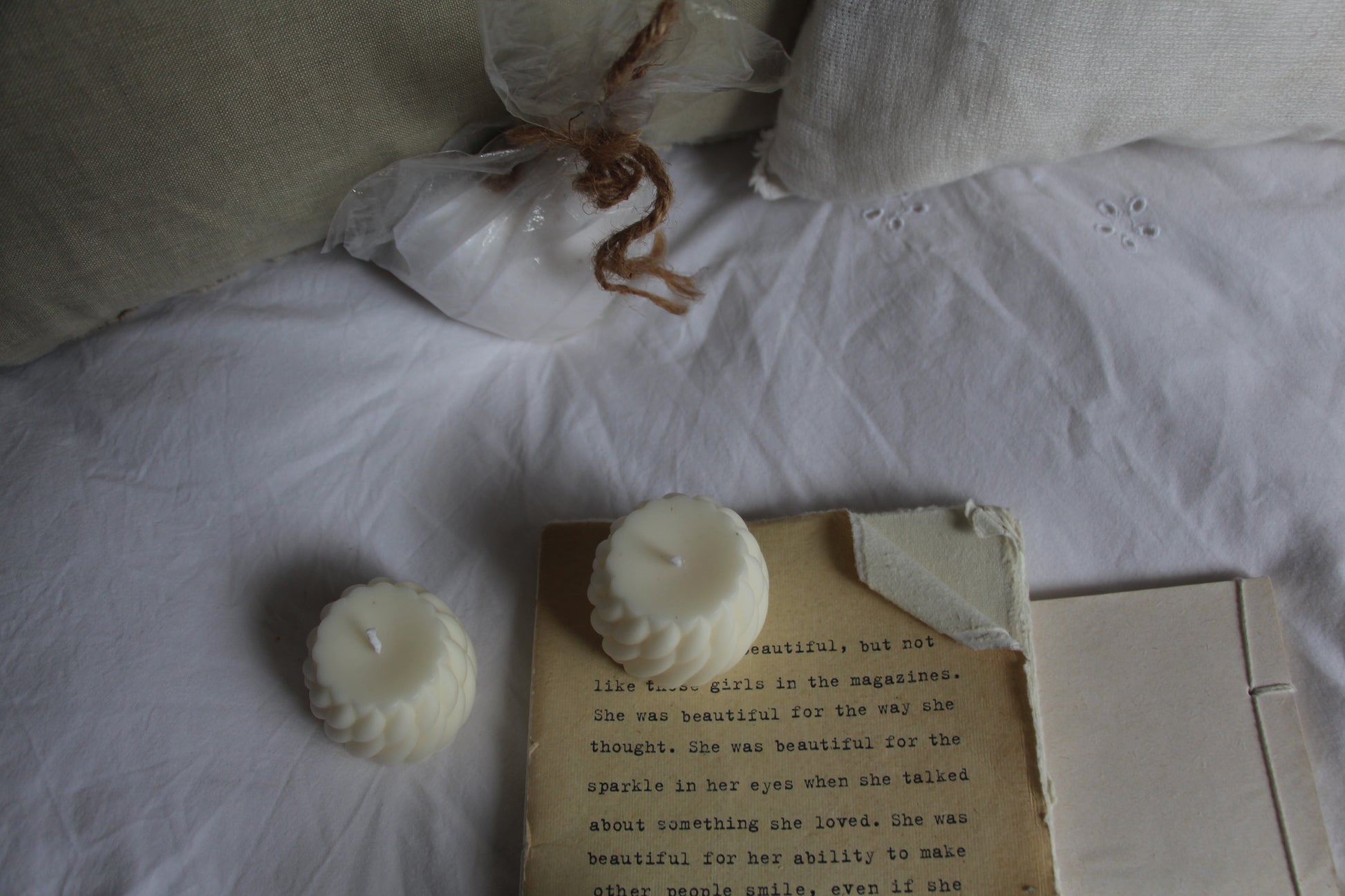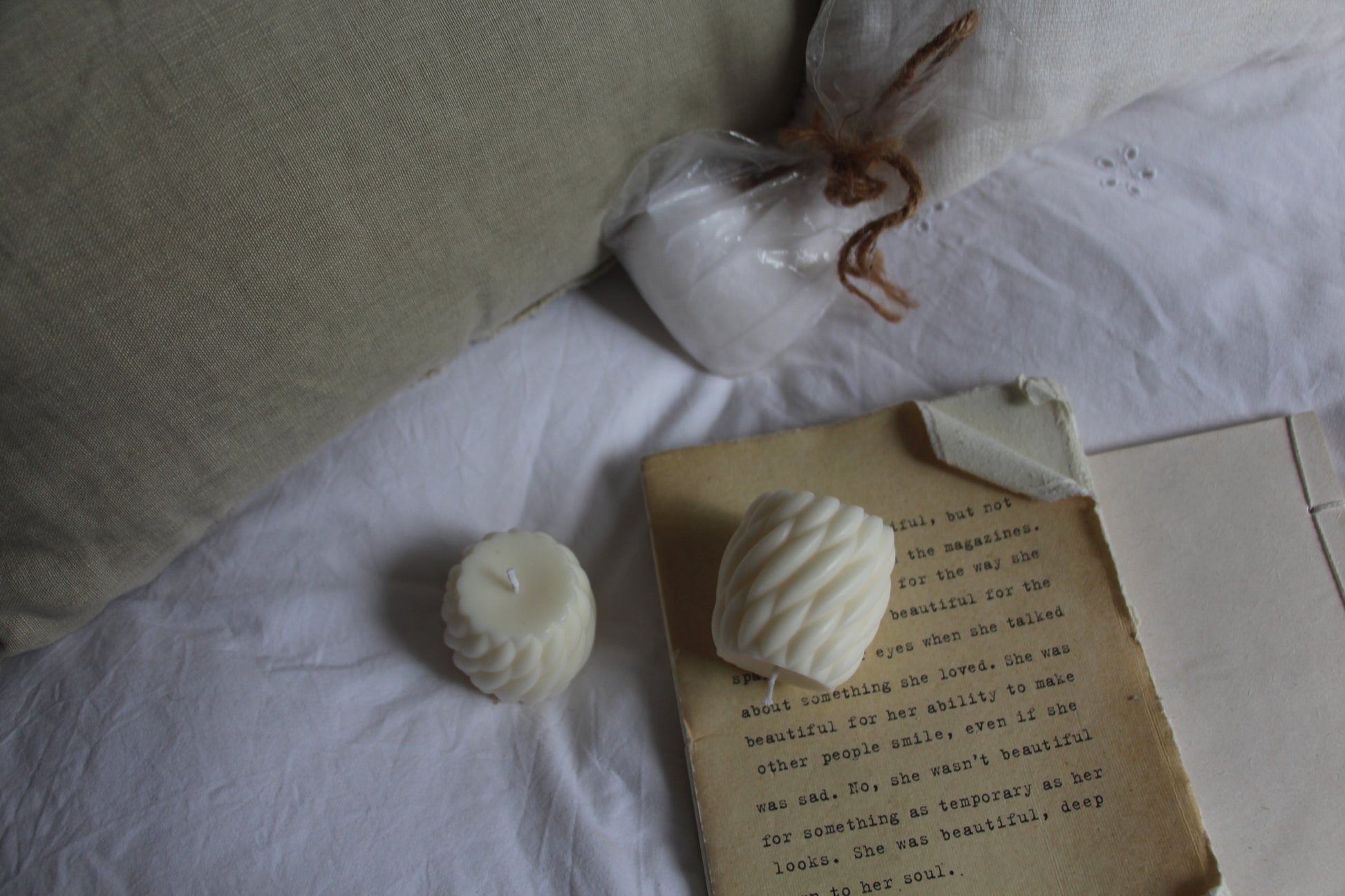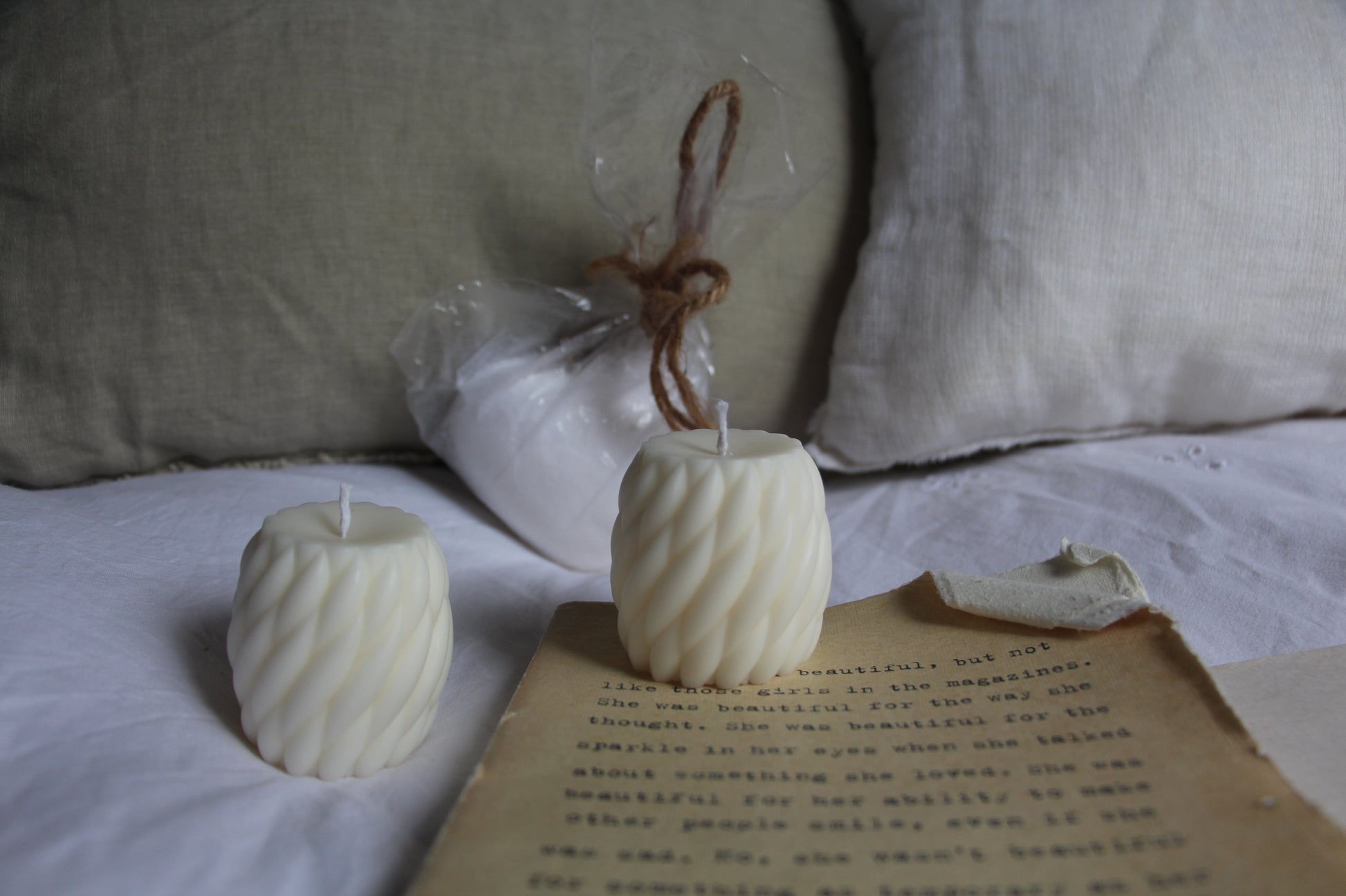 .נר בדוגמא "רקומה" בעבודת ידינו, עשוי שעוות סויה טבעית בניחוח אגס ופרזיה